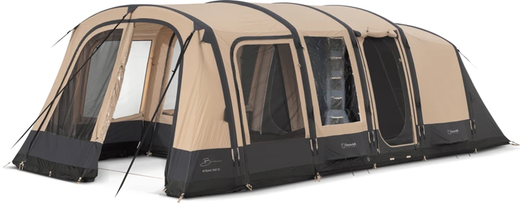 De AirSpace 350 TC opblaasbare tent van Bardani is een rechtwandige tent met extra veel binnenruimte, geschikt voor maximaal vijf personen. Deze Bardani opblaasbare tent is zeer snel op te zetten door middel van een opblaasbaar systeem met luchtbuizen.MaterialenDe buitentent is gemaakt van ademend technisch katoen en de binnentent van normaal technisch katoen. De tent is voorzien van een Oxford polyester (kuip)grondzeil en extra zware 10 mm ritsen. De tenthoeken zijn voorzien van stevige spanbanden en de quick fix reflecterende scheerlijnen zijn voorzien van alu stoppers.VentilatieDe tent is uitgerust met een permanent “Air Vent” ventilatiesysteem aan de achterkant voor een goede ventilatie. Daarnaast is er een regelbaar Ground Air Control System aanwezig.IndelingDe oppomptent is voorzien van een royale luifel aan de voorzijde met een combiwand en wegrolbare zijdeuren inclusief horramen. De leefruimte van de tent heeft een zij-ingang en de deur is extra breed. De twee slaapcabines zijn extra groot met een lengte van 230 cm. Naast dit formaat zullen de donkere binnententen zorgen voor nog meer slaapcomfort.
