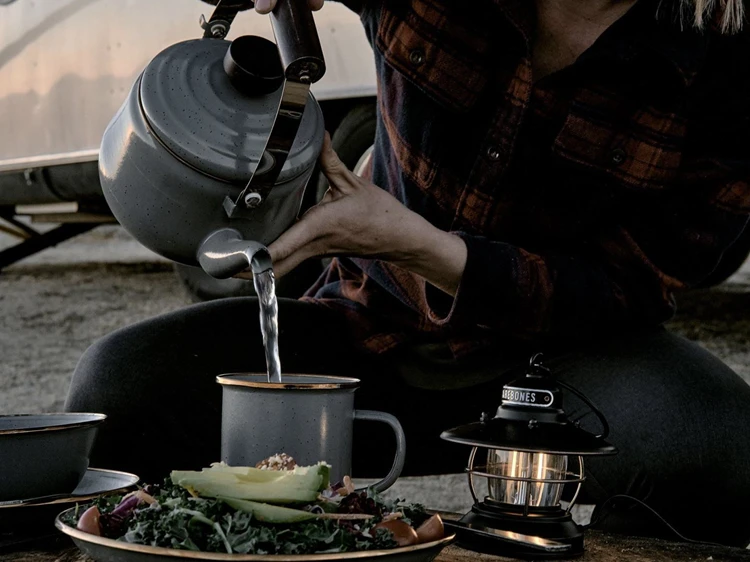 Enamel Cookware. De prachtige geëmailleerde stalen potten en pannen met een koperkleurige RVS stootrand maken elke tafel mooier: of u nu buiten eet of een beetje buiten naar binnen brengt. Elk item heeft een met de hand afgewerkte koperen afwerking, waardoor het unieke stukken worden die toch samen een geheel vormen. Steengrijs. Triple Dipped (3 x geëmailleerd).Matte afwerking. Hitte bestendig tot 700o C. Onbreekbaar.