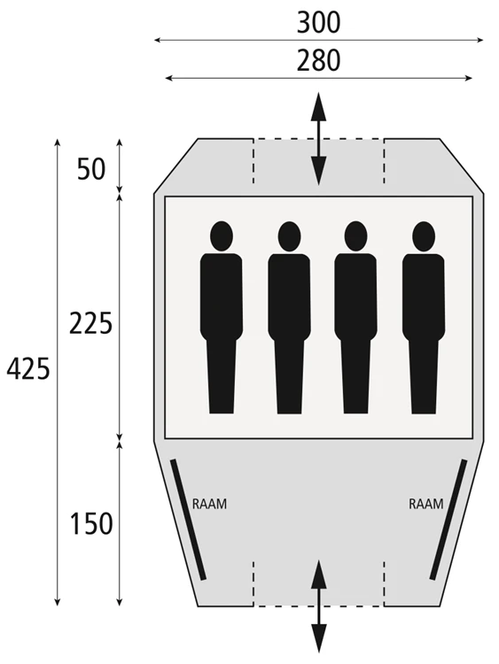 De Safarica Kenia 300 is een grote bijzettent met een slaapcabine voor 4 personen. De voorbouw van de tent is 150 cm diep met afsluitbare ramen waardoor je zelf kan kiezen hoe licht het is in de tent. Aan de acherkant van de tent is nog een extra plek waar je bagage kwijt kan, oftewel er is voldoende ruimte om je spullen in op te bergen. Er zijn twee ingangen voor de tent, zowel aan de voor- als achterkant. De tent is stevig door de fiberglas boogstokken. De tent heeft een stahoogte (185 cm) waar je fijn rechtop in kan staan. Met een totaal gewicht van 8,5 kg is het niet alleen een ruime maar ook lichtgewicht tent. Daarnaast is hij ook eenvoudig op te zetten met maar 3 tentstokken. De tent wordt geleverd met tas, reflecterende scheerlijnen en haringen. De Safarica Kenia 300 is een heerlijk ruime koepeltent voor een geweldige kampeervakantie.