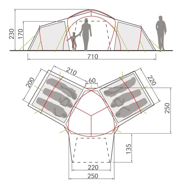 Extravagant ontwerp versmolten met maximale functionaliteit. Ideaal voor iedereen die moe is om achterin de tent te moeten slapen: de binnentent van de Badawi Long is 90 graden gedraaid zoals iedereen in de lengte kan slapen. De tent beschikt over een waterdichtheid met een waterkolom van 3000mm en biedt een uitstekend binnenklimaat. Daarnaast biedt de windstabiele Badawi Long 6P hetzelfde comfortniveau als zijn kleinere broer, de Badawi 4P: een grote binnenruimte, uitstekende ventilatie met het VAUDE Top-Vent-systeem en mesh zijramen, extra zakken in de tentdeuren en een extra grondzeil voor het voorportaal. Kleurgecodeerde stokken en stokslurven vergemakkelijken het opzetten. De constructie met stokken aan de buitenkant laten je de binnen- en buitentent gemakkelijk in één stap opzetten.